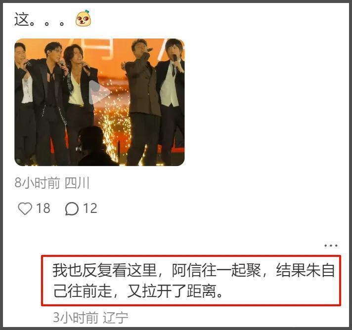 致使朱孝天和言承旭的躯壳讲话也很高明,言承旭往前走的本领未必还撞了一下朱孝天,似乎是念念让他让个位置,但终末大齐唱站位确切太挤,言承旭只可一直侧身。这就导致言承旭全程背对朱孝天,一直到齐唱完了大合照也没转过身来。